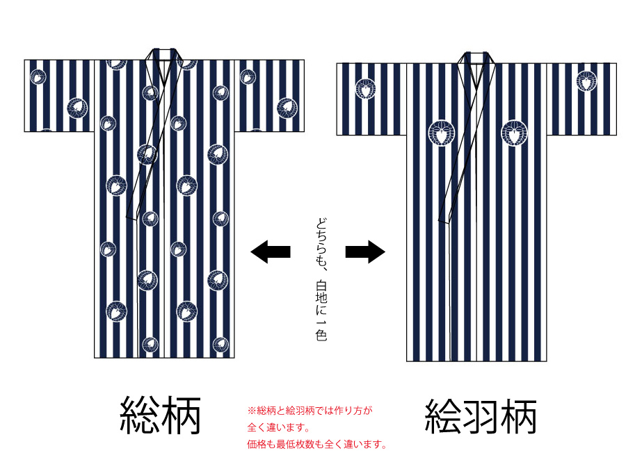 上の写真のように、「1色使った旅館浴衣」と言っても「白地に1色」なのか「地色に白抜き」なのかで違ってきます。